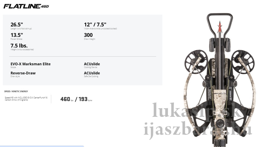 Szeretnél maximális sebességet és pontosságot, de a legkisebb, legkönnyebben kezelhető csomagban? A Flatline 460 számszeríjat azoknak a elkötelezett vadászoknak tervezték, akik egy kompakt íjat szeretnének, anélkül, hogy feláldoznák a teljesítményt.
